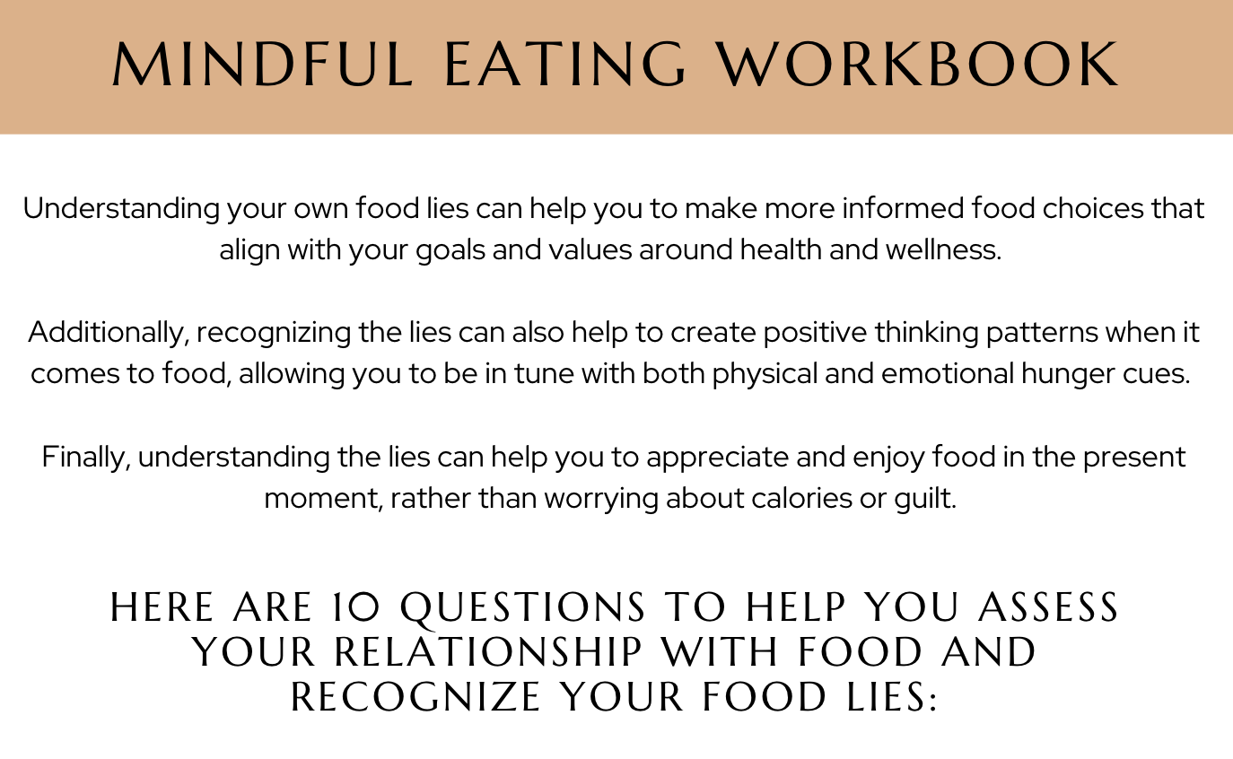 The workbook starts with helping you to document your current thinking about your relationship with food plus any "food lies" that might currently be getting in the way.